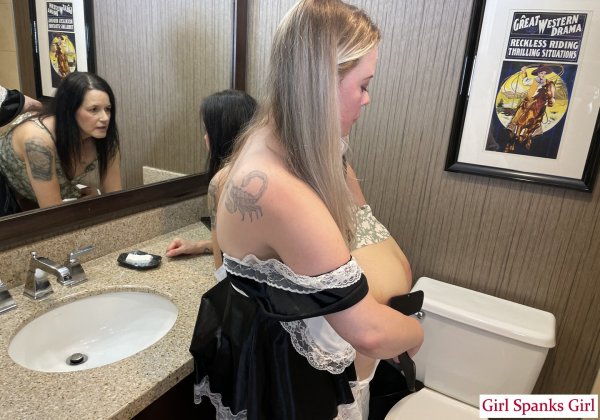 Maid Stevie Rose catches hotel guest Loraine with some very incriminating photos. Loraine tries to deny it and has been treating Stevie very poorly. But now Stevie has some leverage. She has Loraine bend over in the hotel bathroom for a sound spanking and strapping that she will not soon forget. Join now!